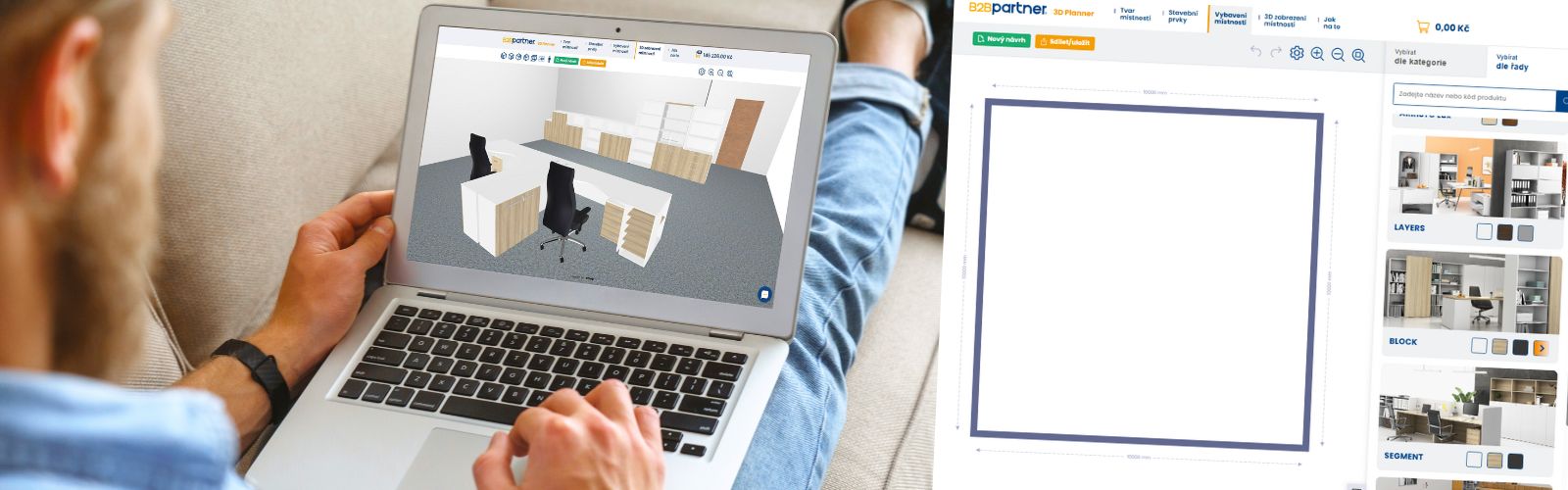 Pomocí praktického 3D plánovače B2B Partner si během pár kroků navrhnete a vybavíte kancelář nábytkem přímo podle vašich představ. Vytvoříte si tak kancelář, která nejen, že odpovídá vašemu rozpočtu, rozměrům místnosti, ale i osobitému stylu. To vše bez nutnosti registrace a instalace jakékoliv aplikace.