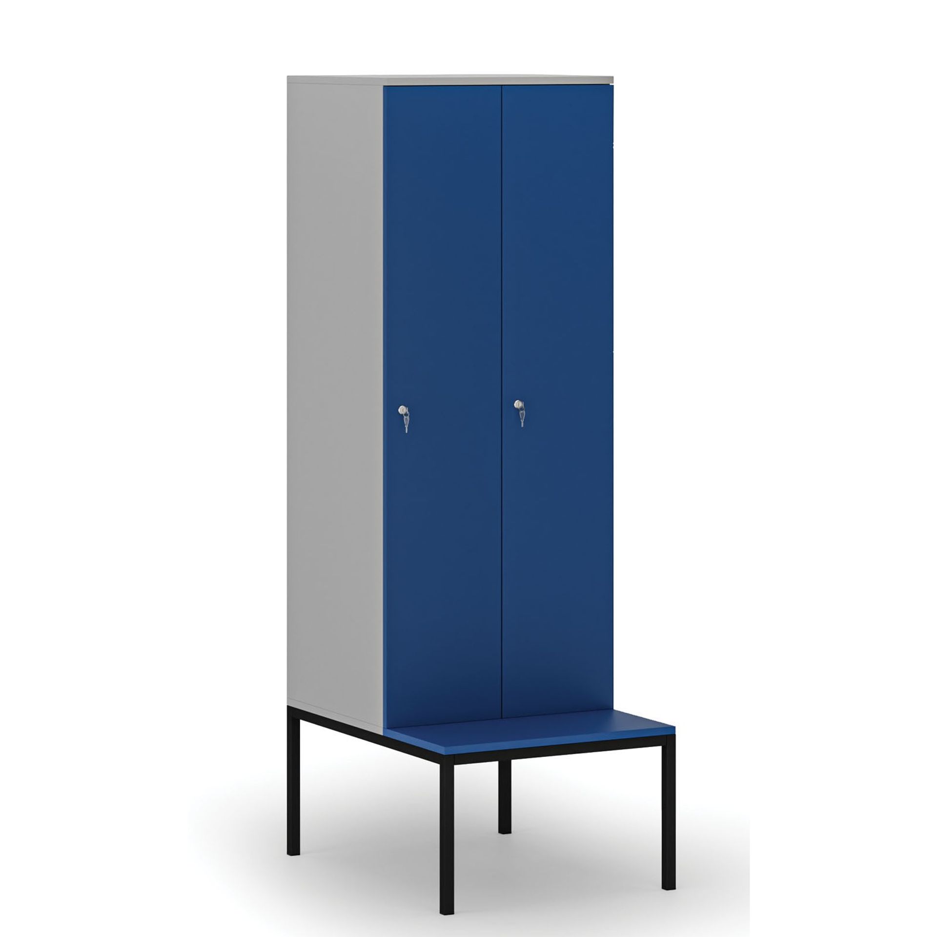 Základnu tvoří kovová lavička vysoká 373 mm s laminovaným sedákem (hloubka 300 mm). Umožňuje pohodlné sezení i převlékání přímo u skříňky a šetří místo, které by jinak zabrala samostatná lavice.