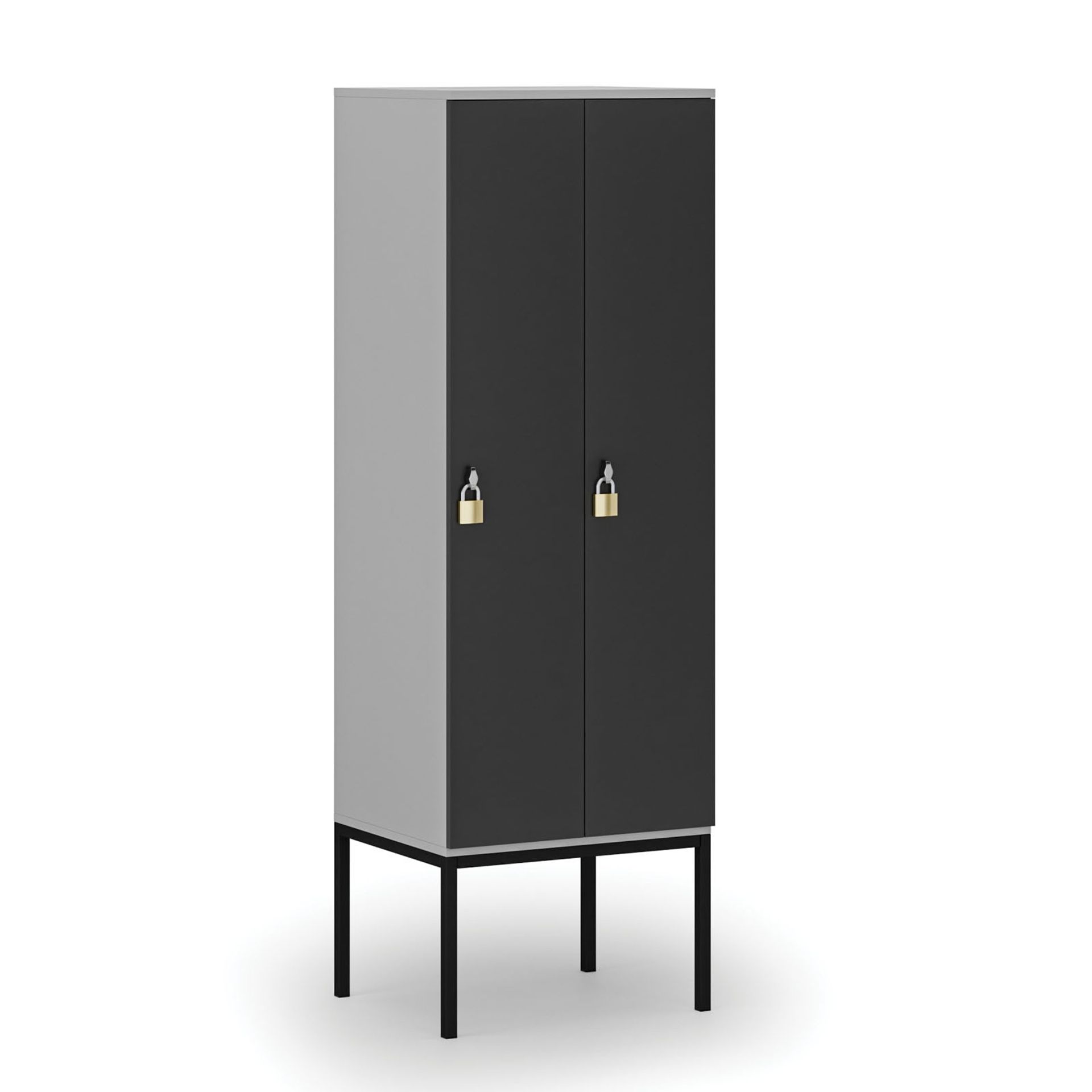 Dřevěná šatní skříň na nožkách pochází z naší vlastní produkce. Zaměřili jsme se především na funkčnost a bezpečnost. Rohy jsou olepeny ABS plastovou hranou. Skříni nechybí ventilace, která je zajištěna otvory v zadní stěně.
