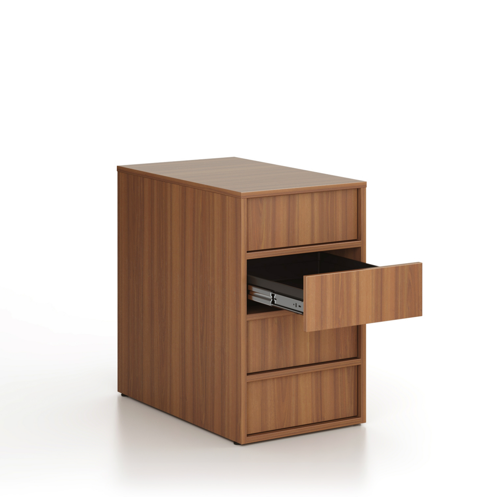 Přístavné kontejnery FRAME přidávají následně praktický úložný prostor přímo u stolu. Pevná konstrukce z laminované dřevotřísky s ABS hranou zaručuje odolnost i dlouhou životnost. Zásuvky s tichým kuličkovým 90% pojezdem a PUSH systémem podtrhují minimalistický, bezúchytkový vzhled kolekce.