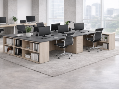Kancelářské sestavy BLOCK představují praktické řešení pro sdílené i soukromé kanceláře, domácí pracovny a úřady. Úložné skříňky, regály nebo kontejnery pod pracovní deskou slouží efektivně jako stabilní podnož stolu a spolu s deskou vytváří kancelářské stoly s úložným prostorem.