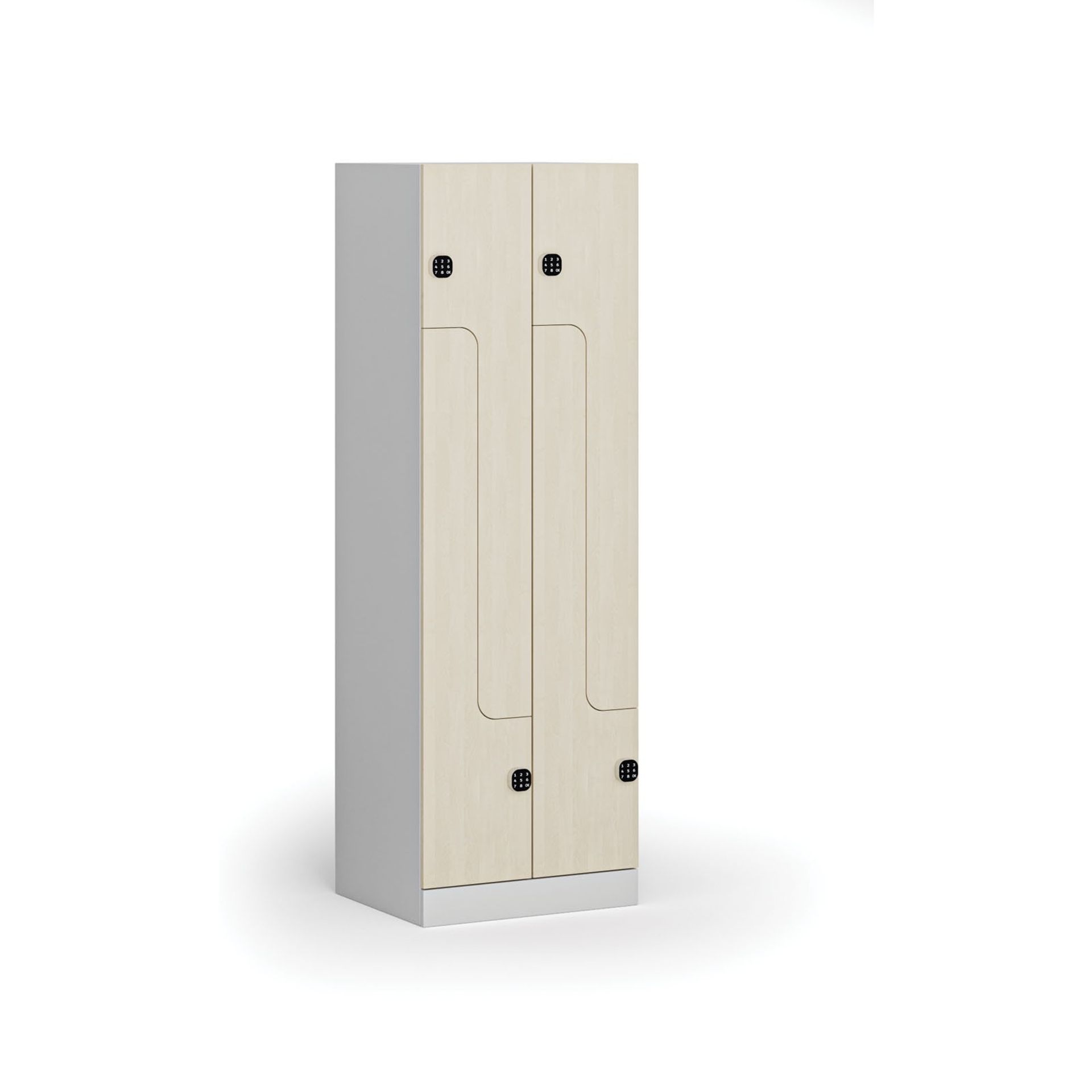 Skříňka typu Z chytře rozděluje prostor jednoho oddílu (šířka 300 mm) na horní a dolní část, přičemž každá slouží jako samostatně uzamykatelný úložný prostor. Skříňka se Z dveřmi je ideální pro 2 osoby nebo jako alternativa k širokým skříňkám s mezistěnou, kde lze oddělit civilní a pracovní oděv. Oproti klasickým skříňkám je však potřeba u skříňky Z počítat s o něco nižší výškou pro zavěšení oděvů – cca 1000 mm.