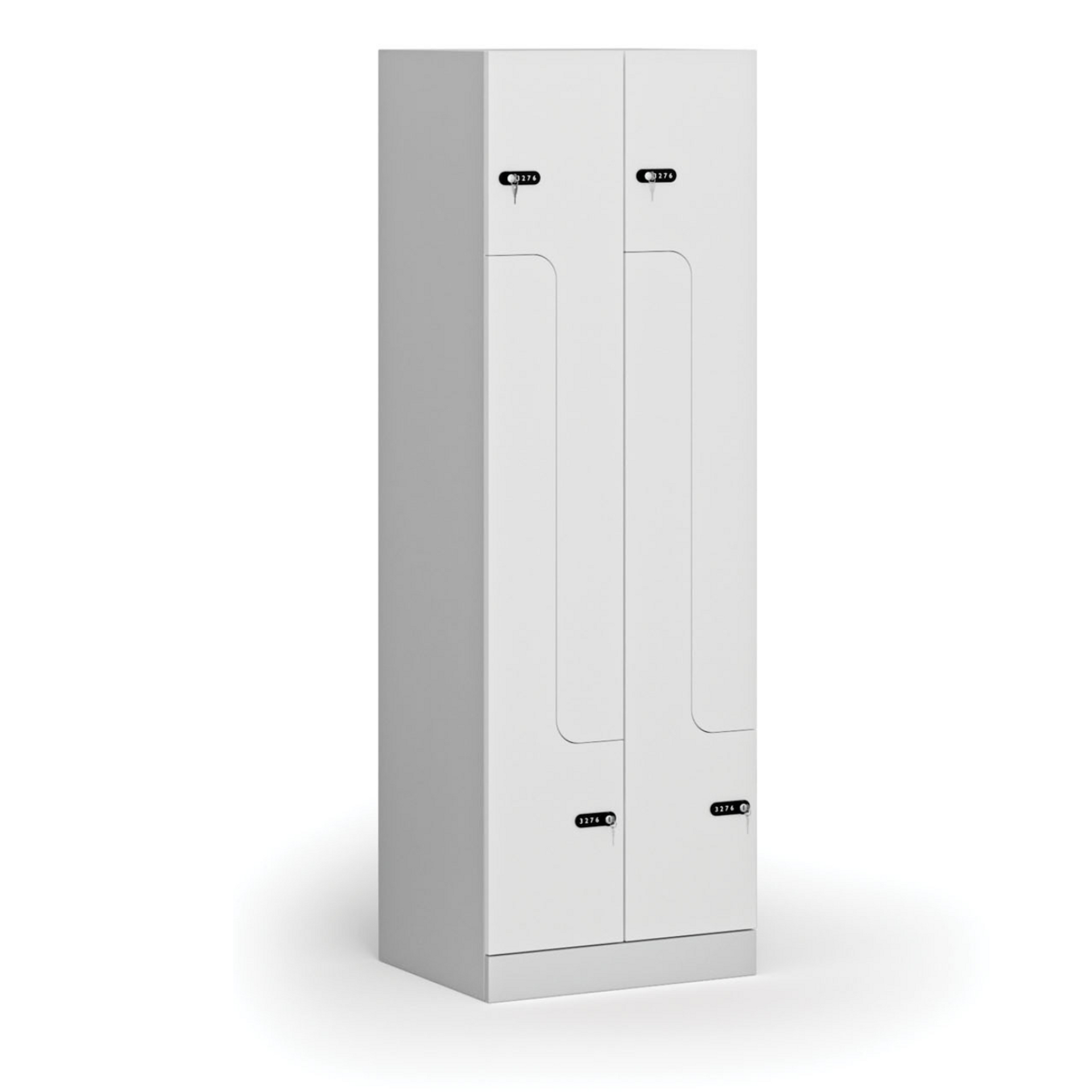Skříňka typu Z chytře rozděluje prostor jednoho oddílu (šířka 300 mm) na horní a dolní část, přičemž každá slouží jako samostatně uzamykatelný úložný prostor. Skříňka se Z dveřmi je ideální pro 2 osoby nebo jako alternativa k širokým skříňkám s mezistěnou, kde lze oddělit civilní a pracovní oděv. Oproti klasickým skříňkám je však potřeba u skříňky Z počítat s o něco nižší výškou pro zavěšení oděvů – cca 1000 mm.