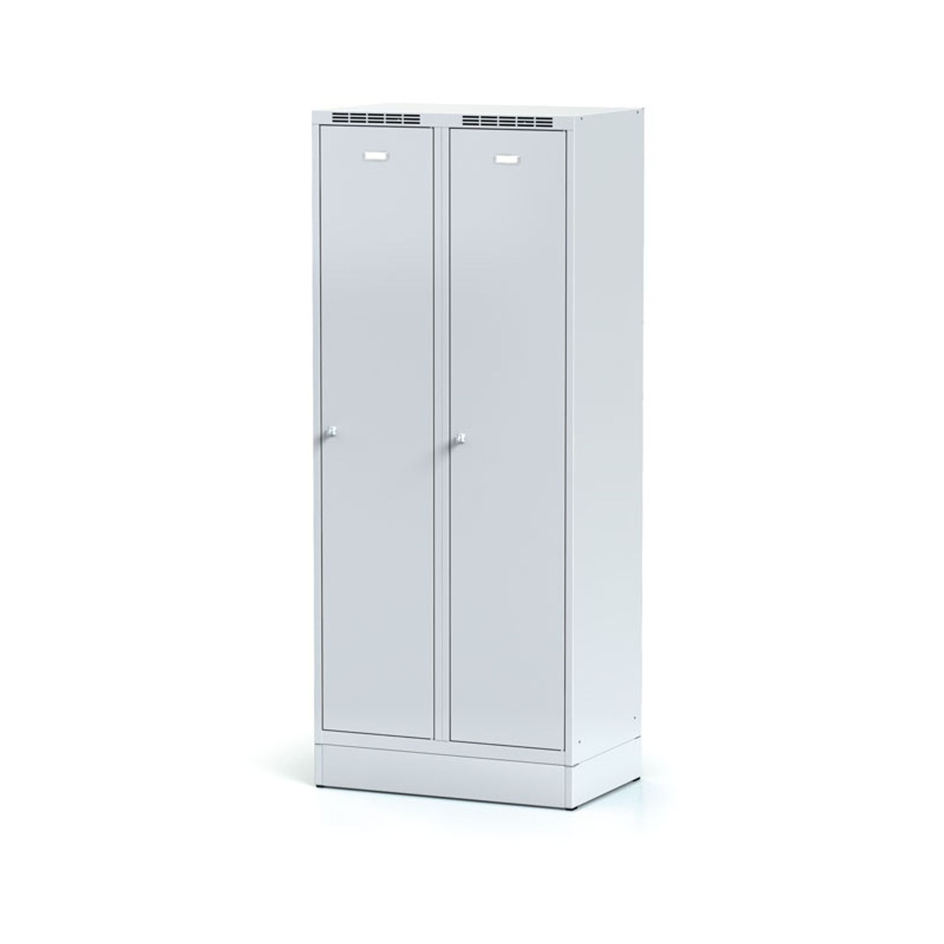 Skříňku tvoří 2 rozšířené části o šířce oddílu až 400 mm, které poskytují více místa než standardní varianty. Každý oddíl je navíc rozdělen pevnou mezistěnou, díky čemuž lze snadno oddělit civilní a pracovní oděv. Větší šířka zajišťuje pohodlné uložení i objemnějších věcí.