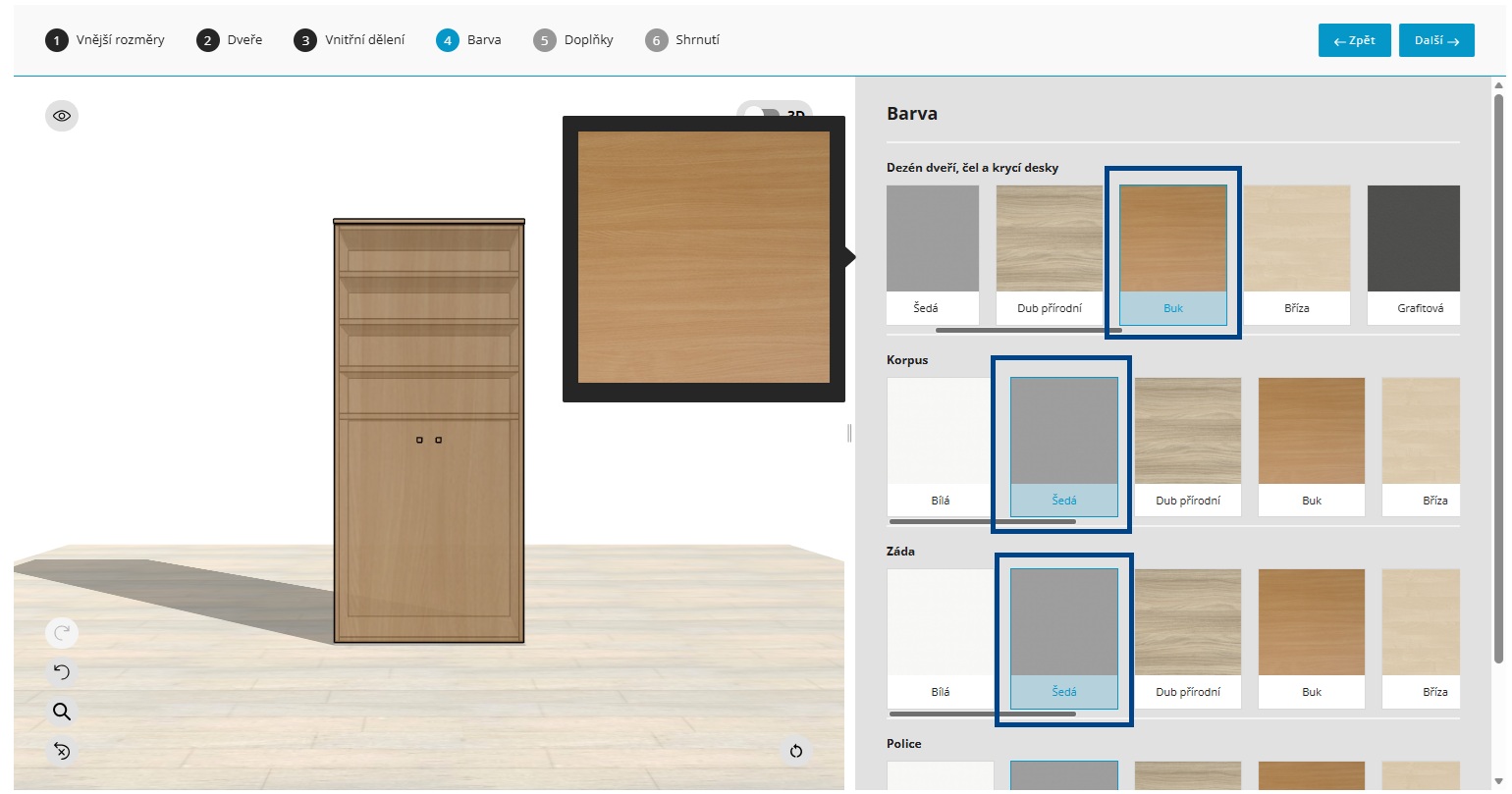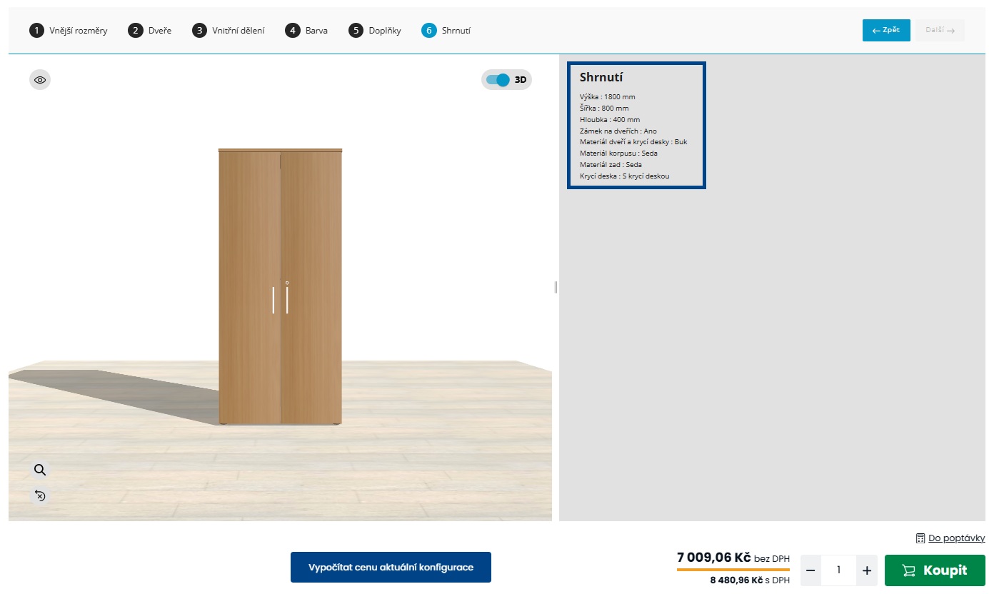Skříň, kterou si můžete upravit podle sebe. Je libo police nebo šatní skříň? Rozměry na milimetr, vnitřní uspořádání, přizpůsobení dveří i barvy. Cena se mění podle zadaných parametrů, takže přesně vidíte, za co platíte.