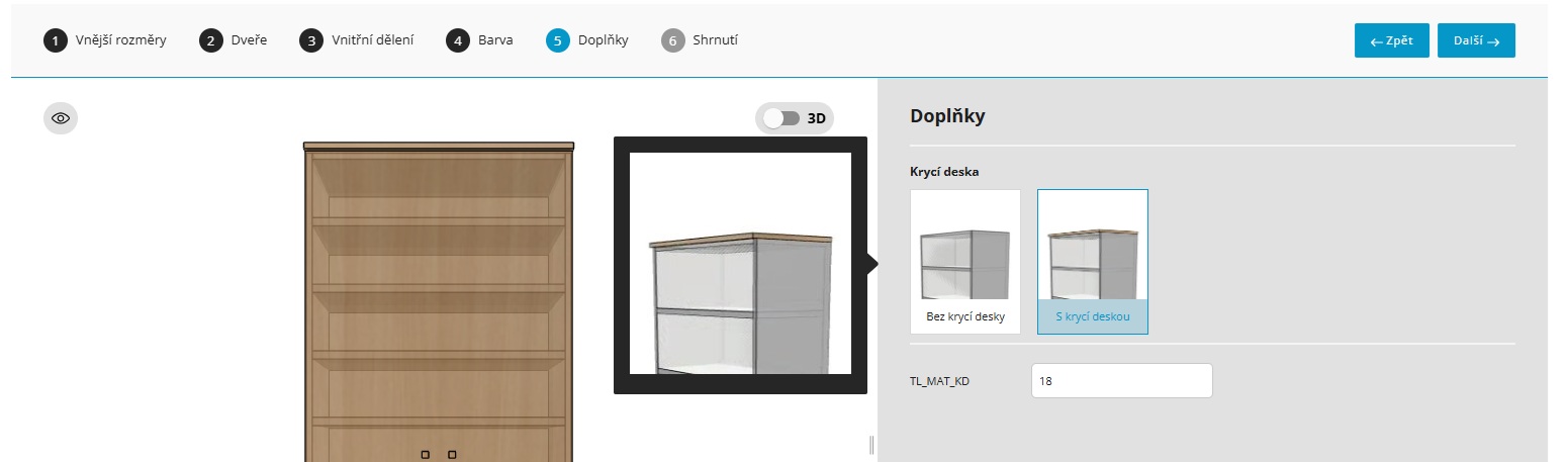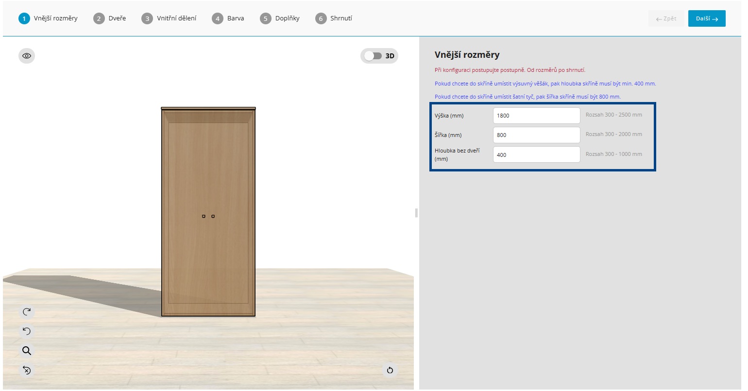 Přichází samotné ladění nábytku podle vašich potřeb. V konfigurátoru postupujete přehledně krok za krokem - od rozměrů až po finální podobu návrhu. Jednotlivé kroky se mohou lišit podle typu zvoleného nábytku, vždy vás ale provedou celým procesem bez složitého nastavování.