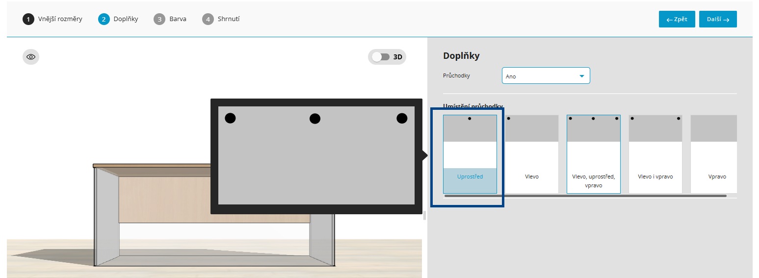 Návrh se v konfigurátoru vždy zobrazuje v řezovém (průhledovém) 3D zobrazení pro kontrolu vnitřního uspořádání v každém kroku konfigurace. Přepnutím kdykoliv během návrhu do 3D náhledu uvidíte nábytek v realističtější podobě.