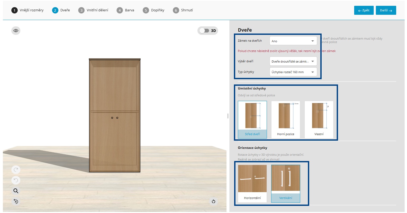 U skříní si můžete v rámci sekce “Dveře” snadno zvolit nejen jejich typ a způsob otevírání, ale i drobné detaily, které usnadní jejich každodenní používání.