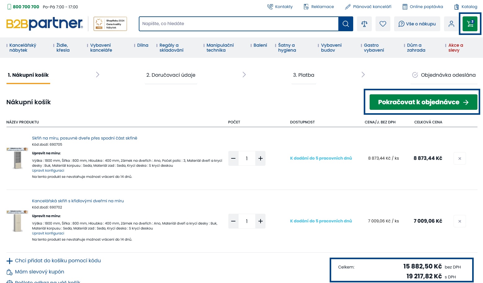 V košíku vidíte všechny nakonfigurované prvky, můžete upravit jejich množství nebo se vrátit k úpravě konfigurace a uložit změny. Zároveň v košíku uvidíte celkovou cenu bez DPH i s DPH za všechny vložené konfigurace.