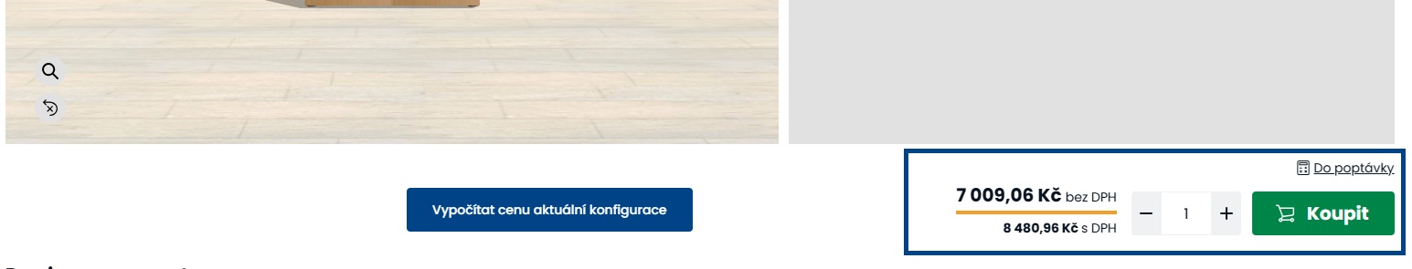 Cena se automaticky přepočítává podle zvolených parametrů při jakékoliv změně v průběhu celé konfigurace a je viditelná ještě před vložením produktu do košíku.