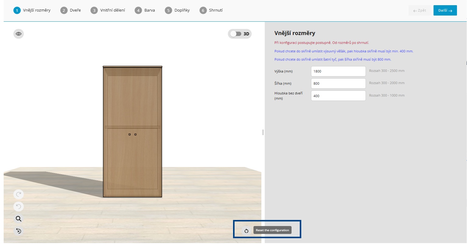 Při prvním spuštění se produkt automaticky zobrazí ve výchozím nastavení. Pokud se budete chtít kdykoliv během práce vrátit k tomuto výchozímu stavu, návrh smazat a začít se zcela novým návrhem, použijte tlačítko „Reset the configuration“.
