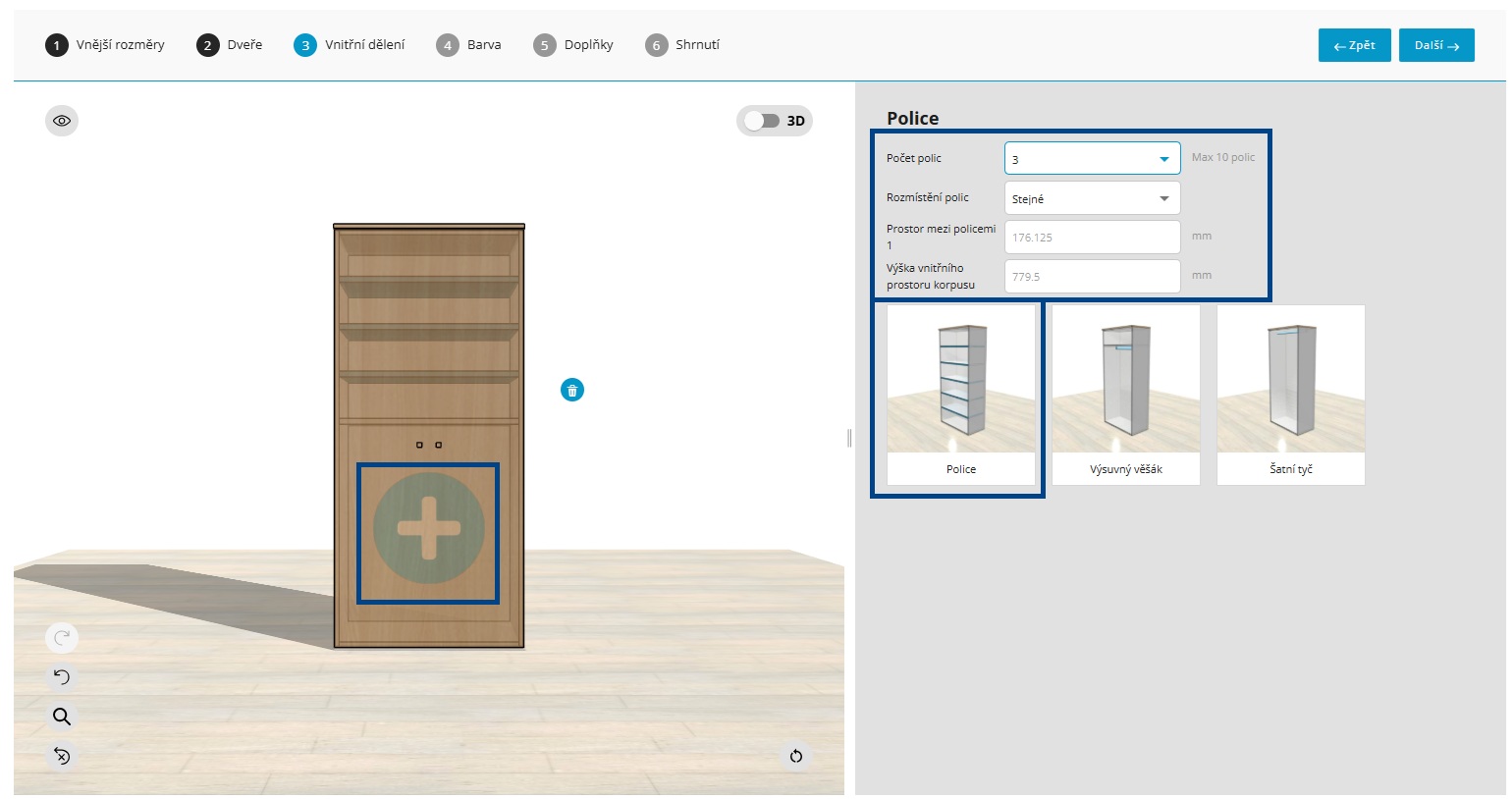 Tato část je v konfigurátoru zobrazena pouze u regálů a skříní a slouží k nastavení vnitřního uspořádání podle toho, k čemu vám bude produkt skutečně sloužit - zvolit můžete prvky pro uložení dokumentů, oblečení i kombinaci obojího.