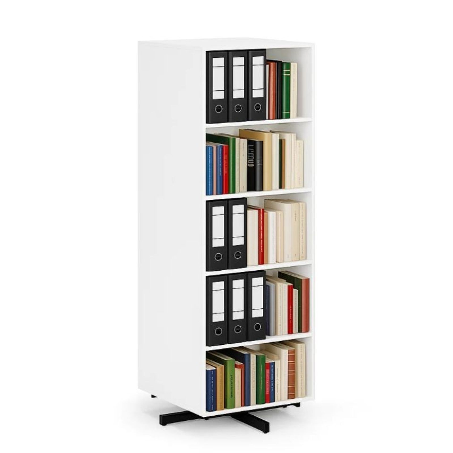 Regál má na dvou stranách 5 pater (tj. 5 policových úrovní), které vytváří 10 otevřených oddílů. Každý oddíl nabízí dostatek prostoru i pro standardní šanony – na výšku i na šířku. Otočný systém je ukotven na robustní černé kovové základně s ložiskem, která zajišťuje stabilitu a plynulé otáčení.