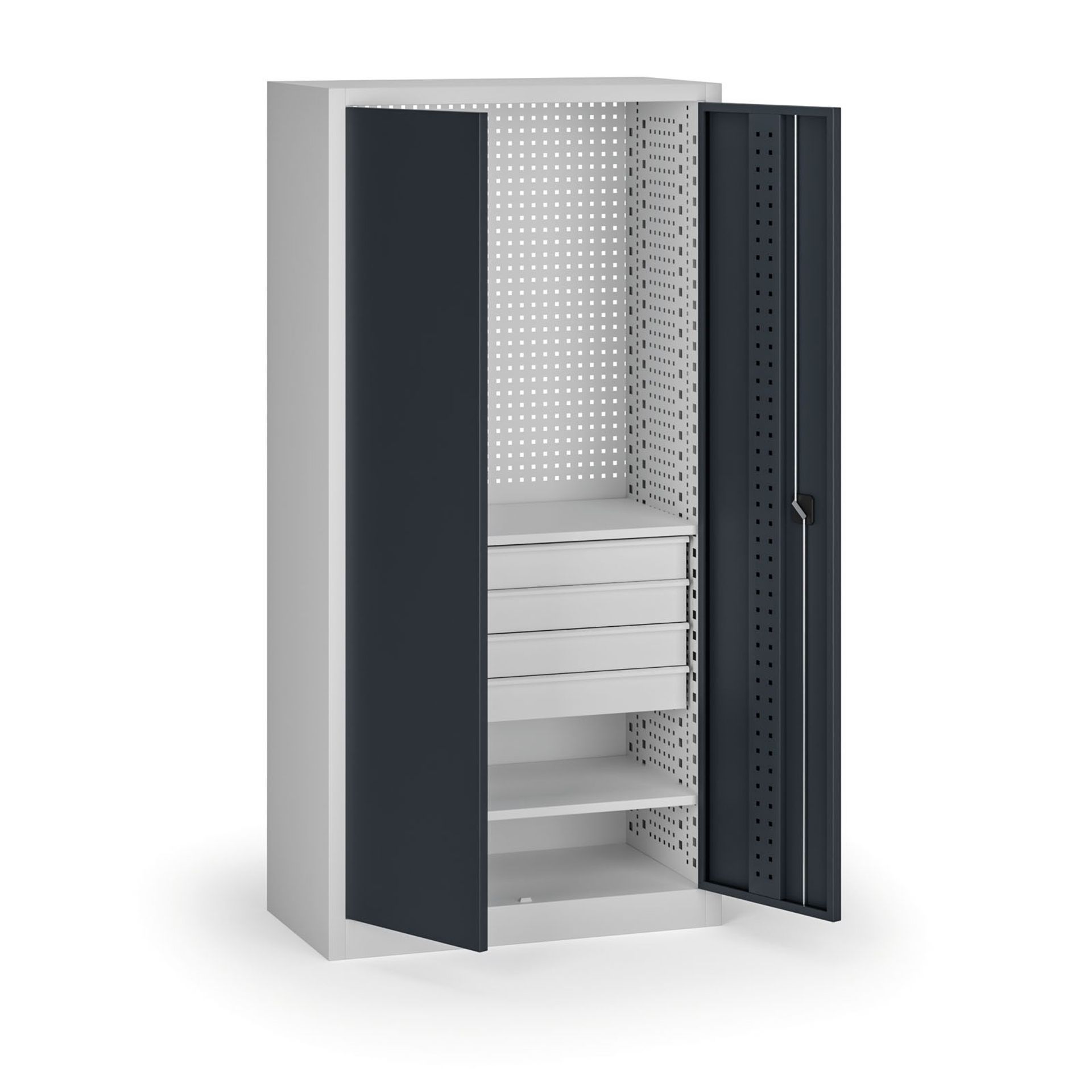 Vysoká skříň se 2 policemi a 4 zásuvkami (100 mm), Perforace vnitřní strany dveří, boků i zadní stěny (EuroPerfo 10 × 10 mm, rozteč 38 × 38 mm), korpus RAL 7035, nosnost 400 kg.