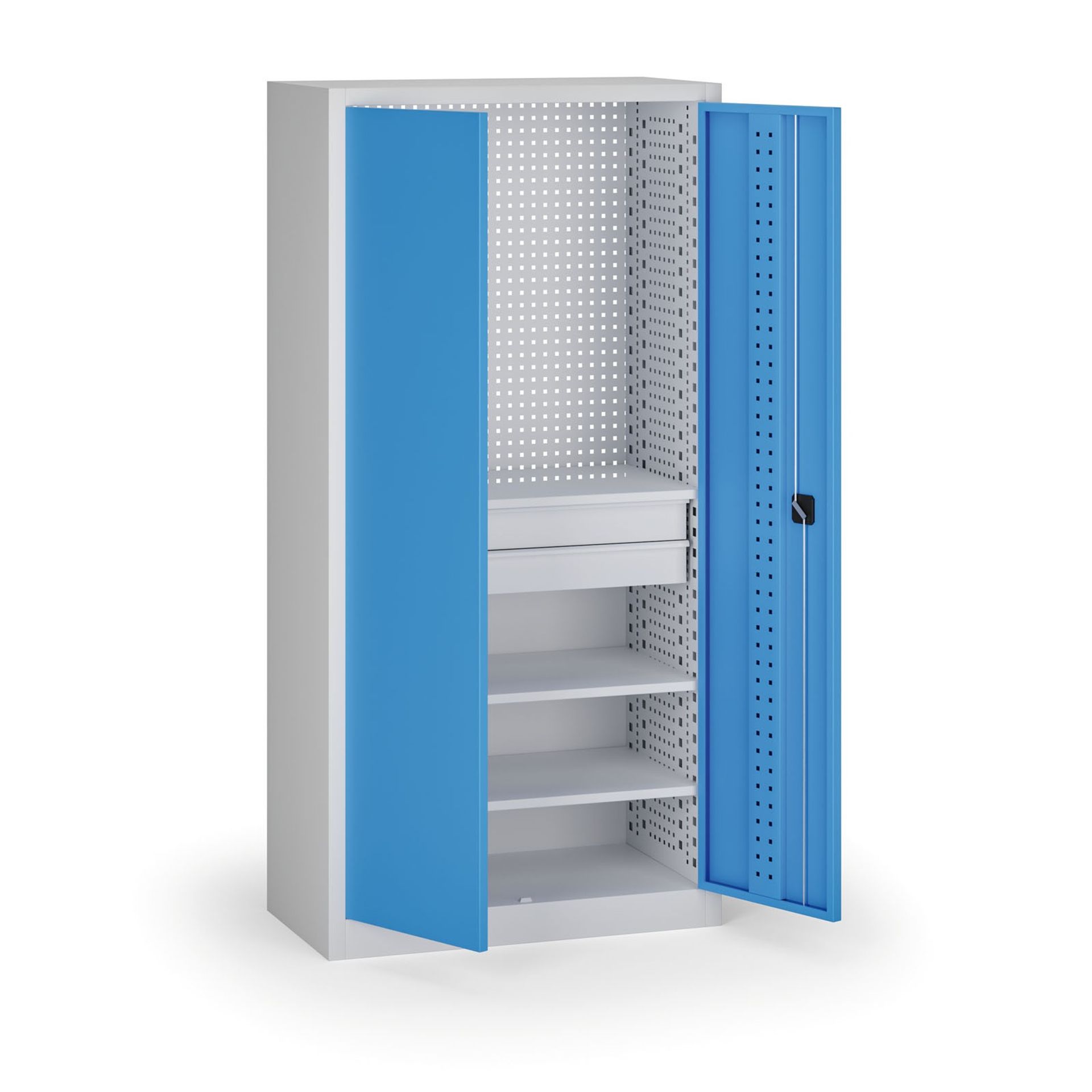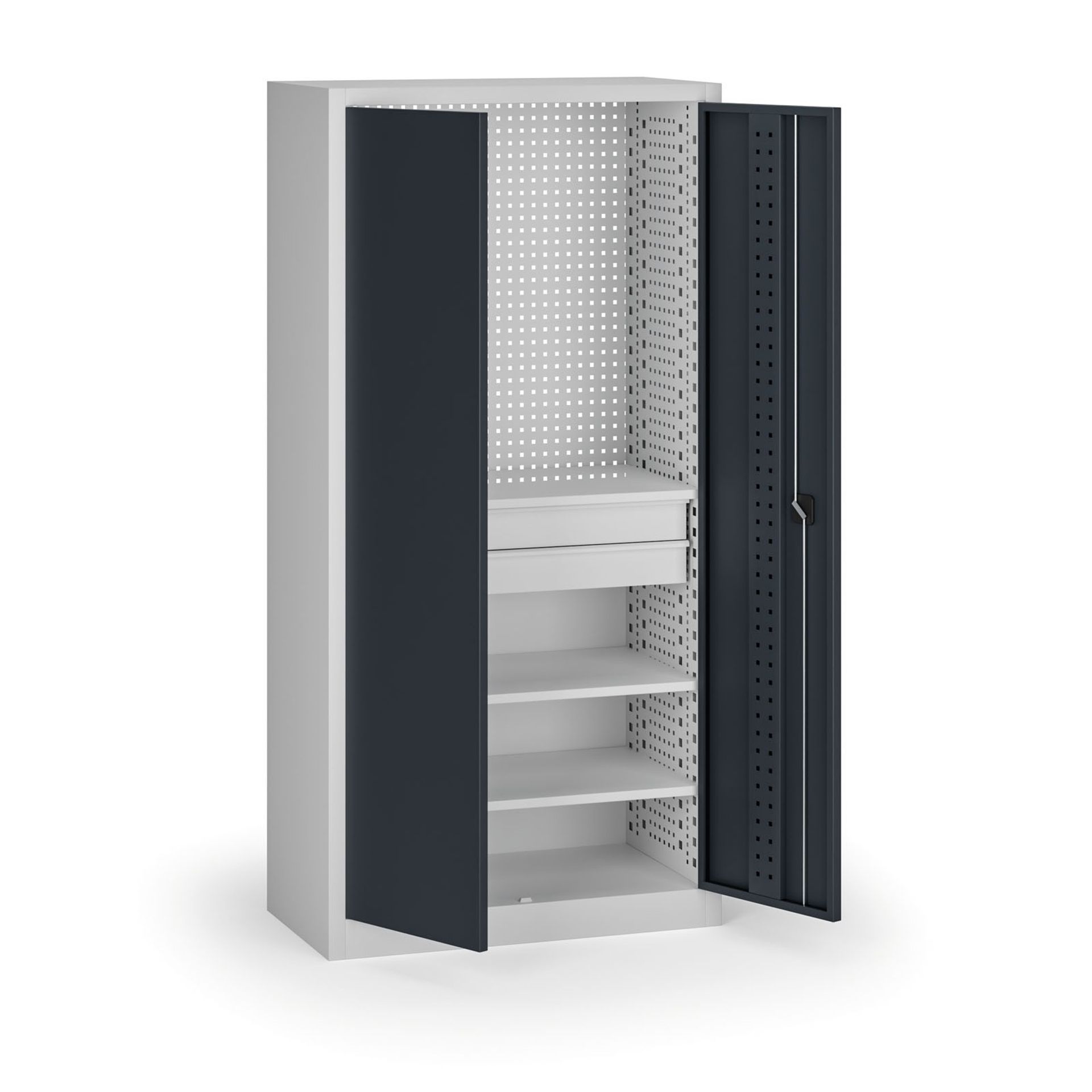 Model s plnou perforací na dveřích, bocích i zadní stěně pro maximální přehled a možnost využití závěsných doplňků. Skříň má tři výškově stavitelné police a dvě zásuvky o výšce 100 mm. Zásuvky jsou plnovýsuvné, přestavitelné po 50 mm, s nosností 35 kg. Police unesou 60 kg při rovnoměrném zatížení.