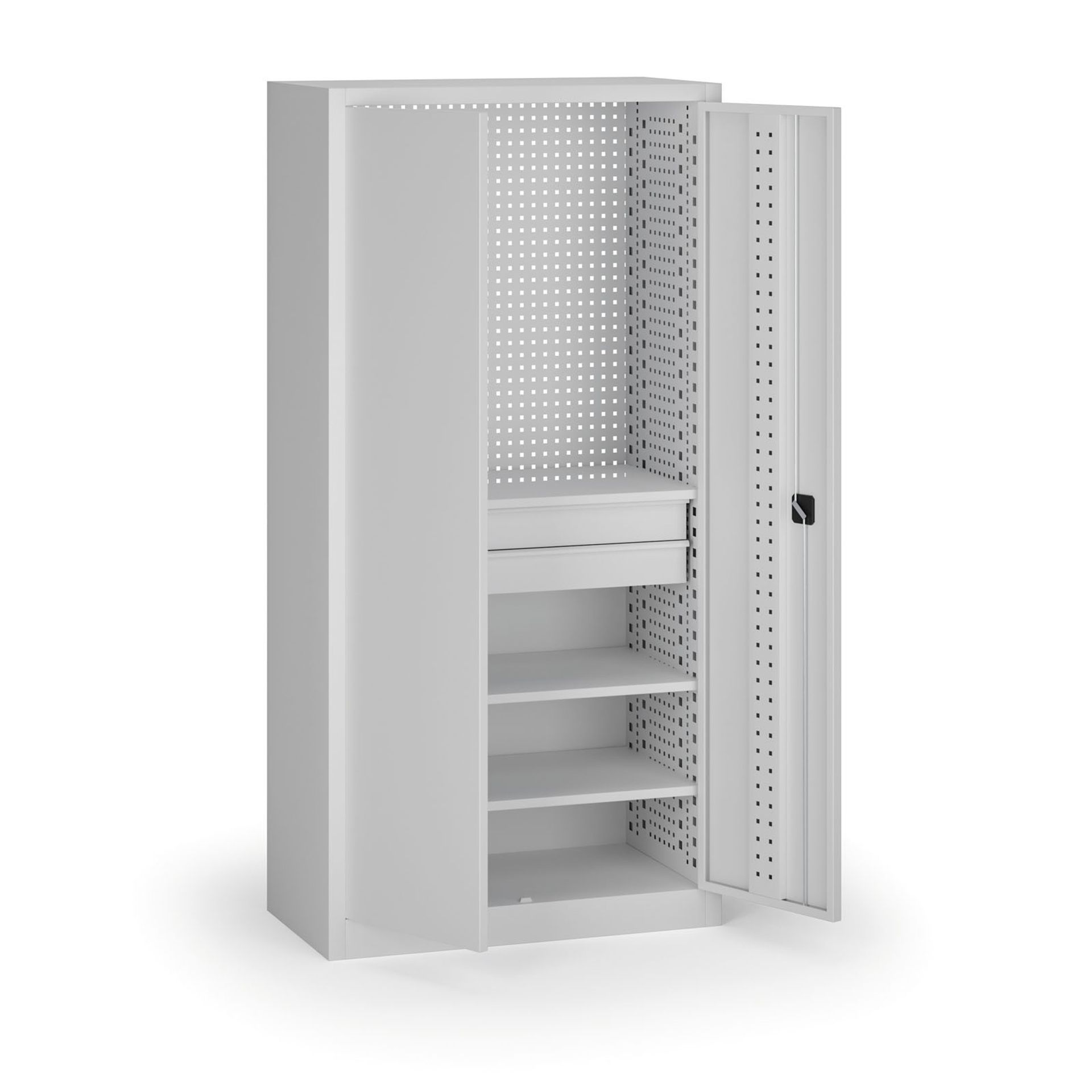 Skříň se 3 policemi a 2 zásuvkami (2 × 100 mm), plná perforace (dveře, boky i zadní stěna – EuroPerfo 10 × 10 mm, rozteč 38 × 38 mm), korpus RAL 7035, nosnost 400 kg.