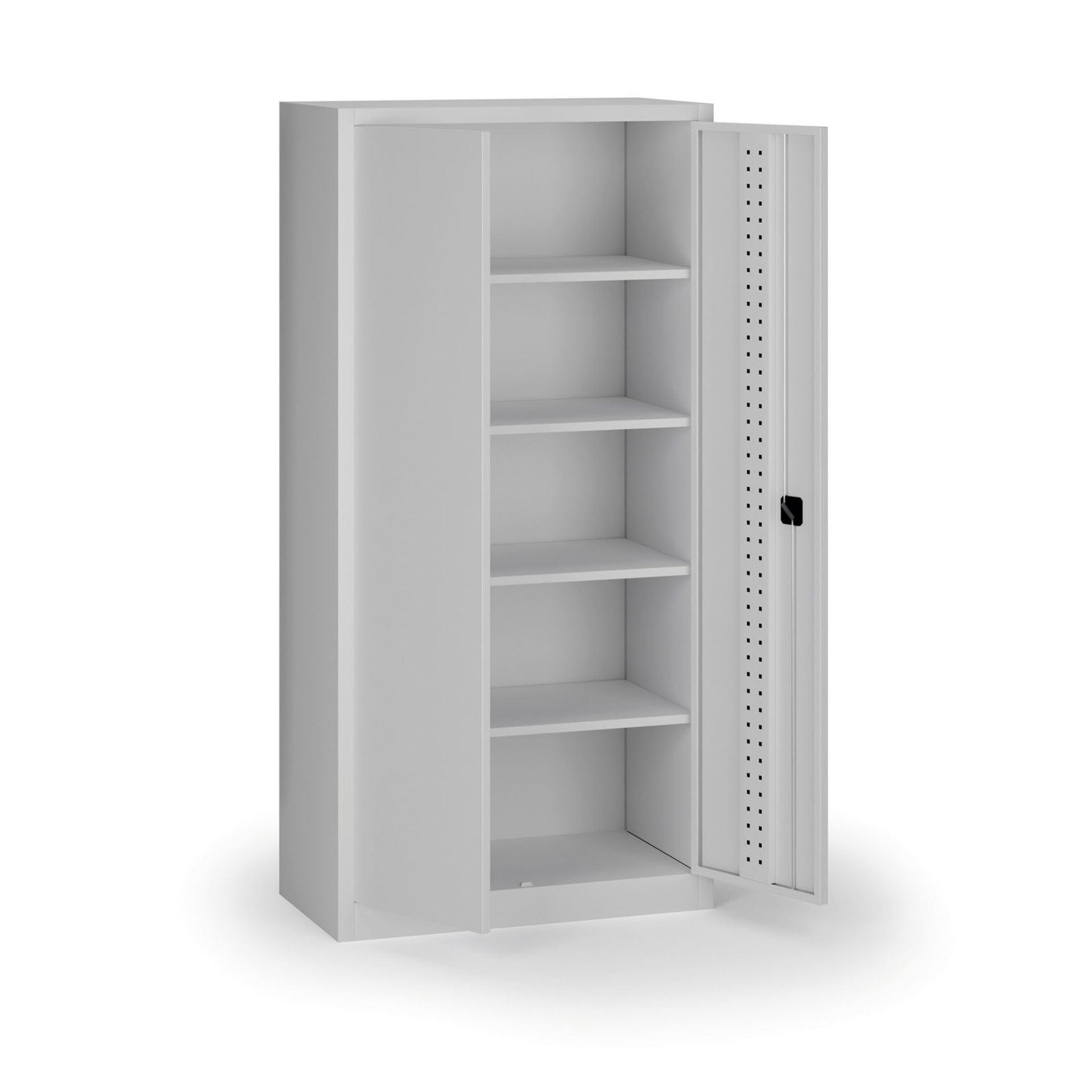Vysoká dílenská skříň se 4 policemi, perforace na vnitřní straně dveří (EuroPerfo 10 × 10 mm, rozteč 38 × 38 mm), hladké boky, korpus RAL 7035, nosnost 400 kg.