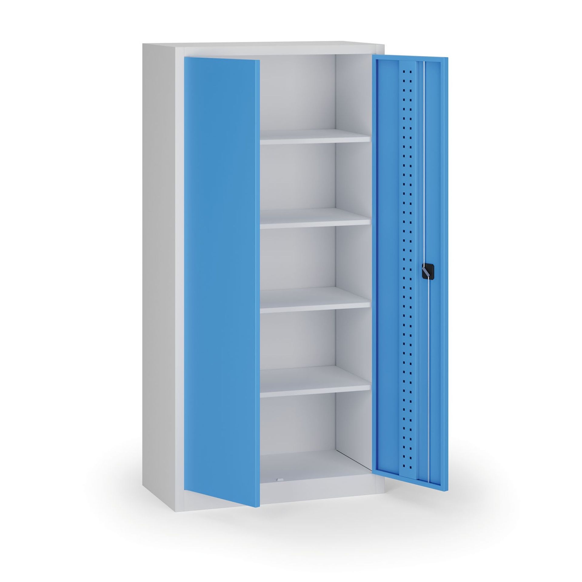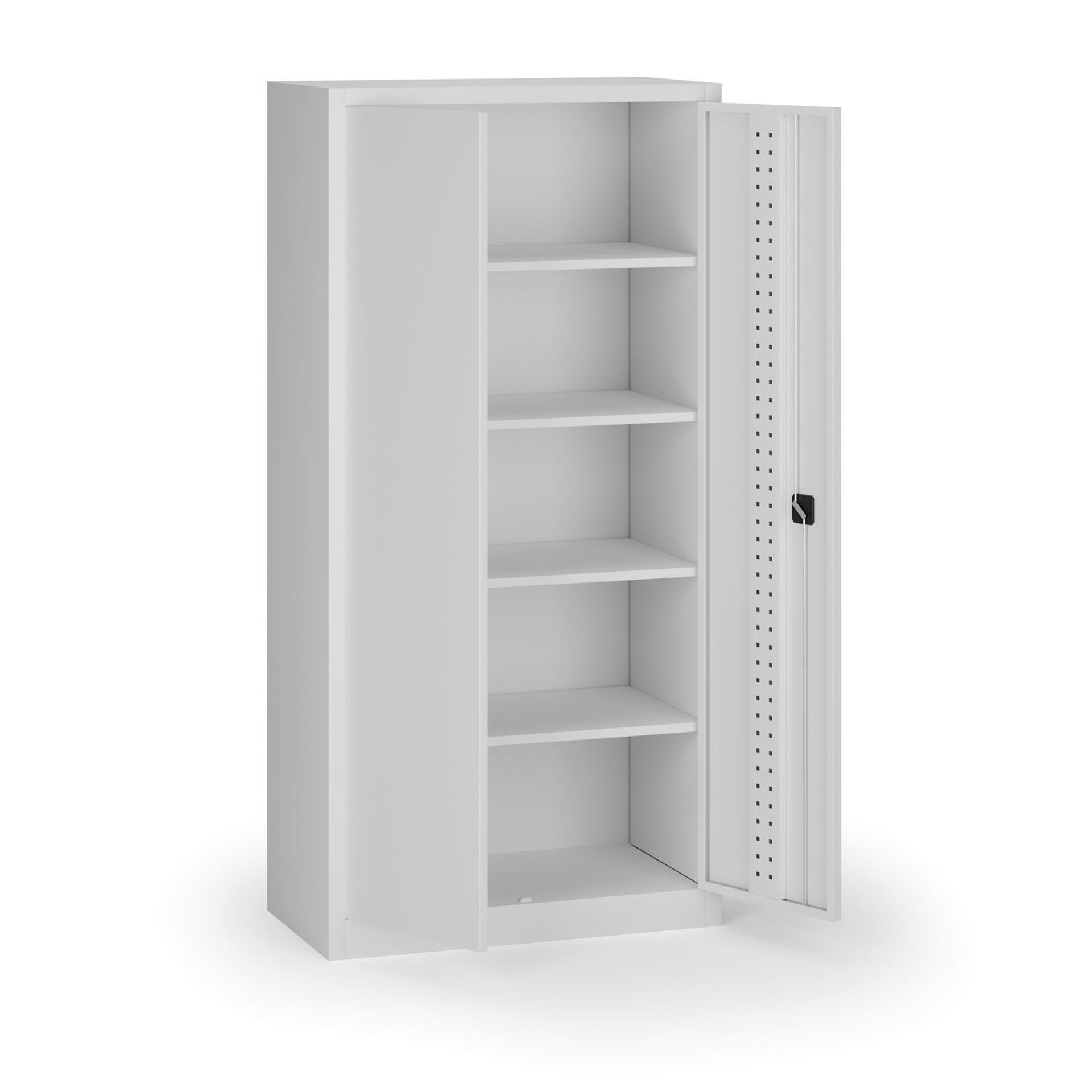 Vysoká dílenská skříň se 4 policemi, perforace na vnitřní straně dveří (EuroPerfo 10 × 10 mm, rozteč 38 × 38 mm), hladké boky, korpus RAL 7035, nosnost 400 kg.