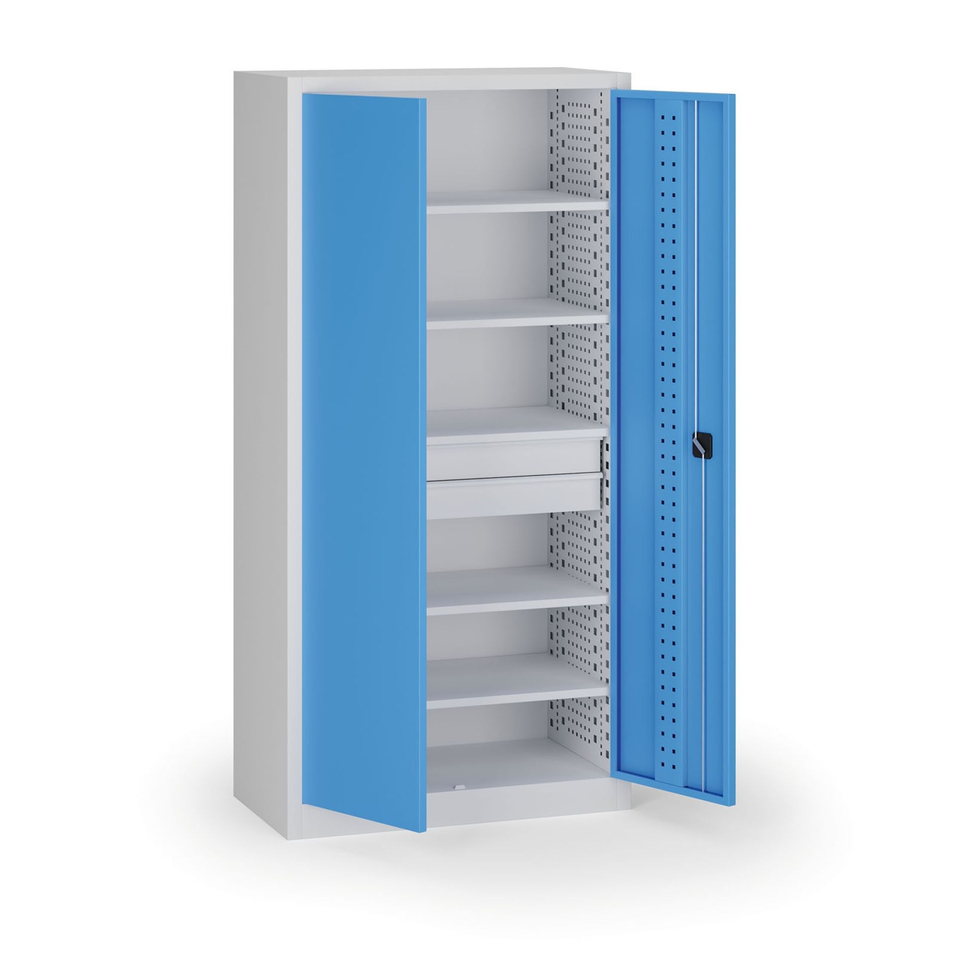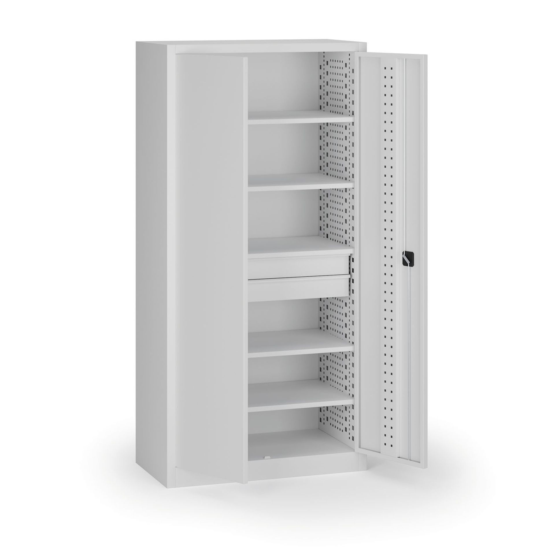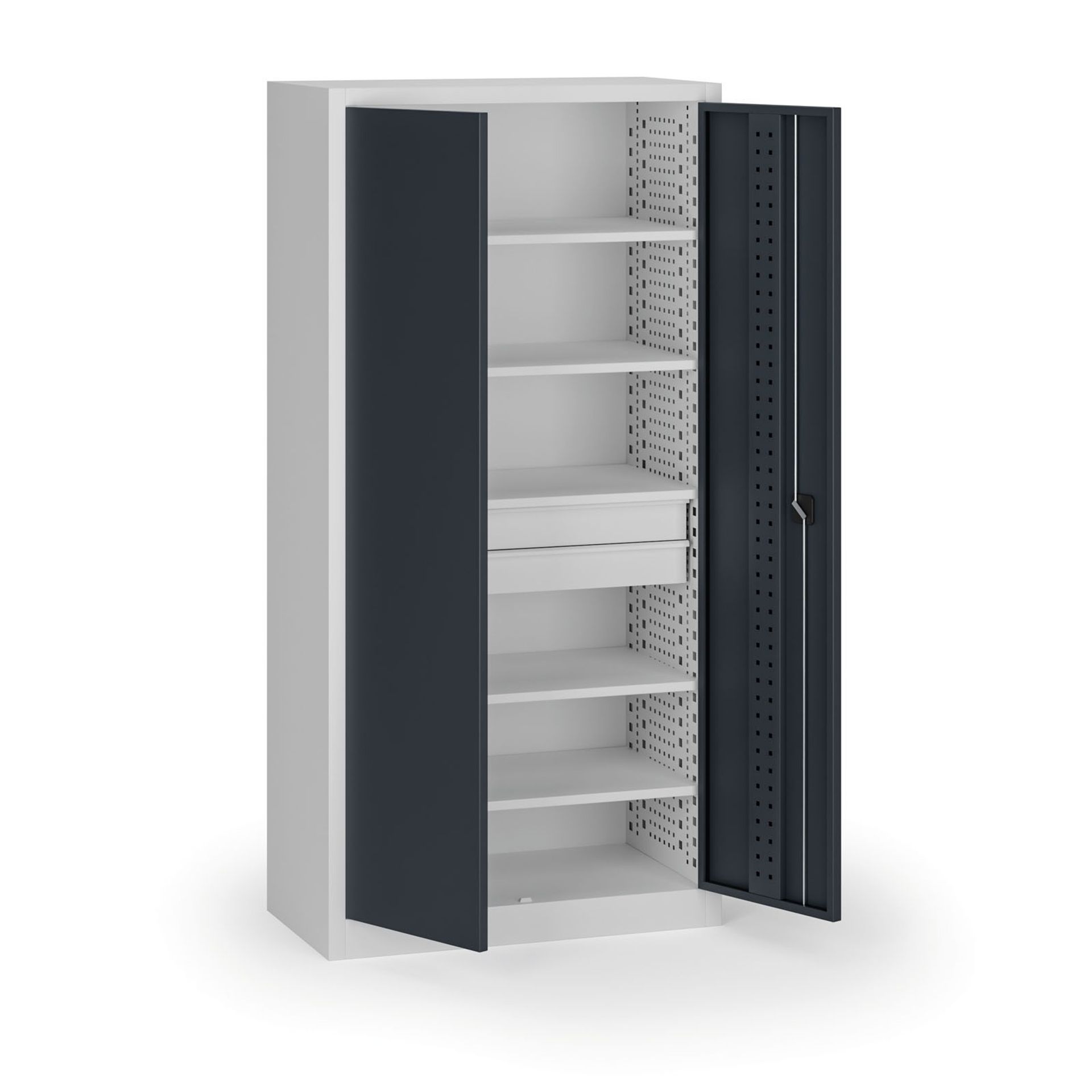 /Dílenský nábytek a vybavení/Dílenské skříně/Dílenské skříně s policemi/Policová dílenská skříň 2-dveřová, 5 polic + 2 zásuvky, 1950 × 950 × 500 mm, šedé dveře