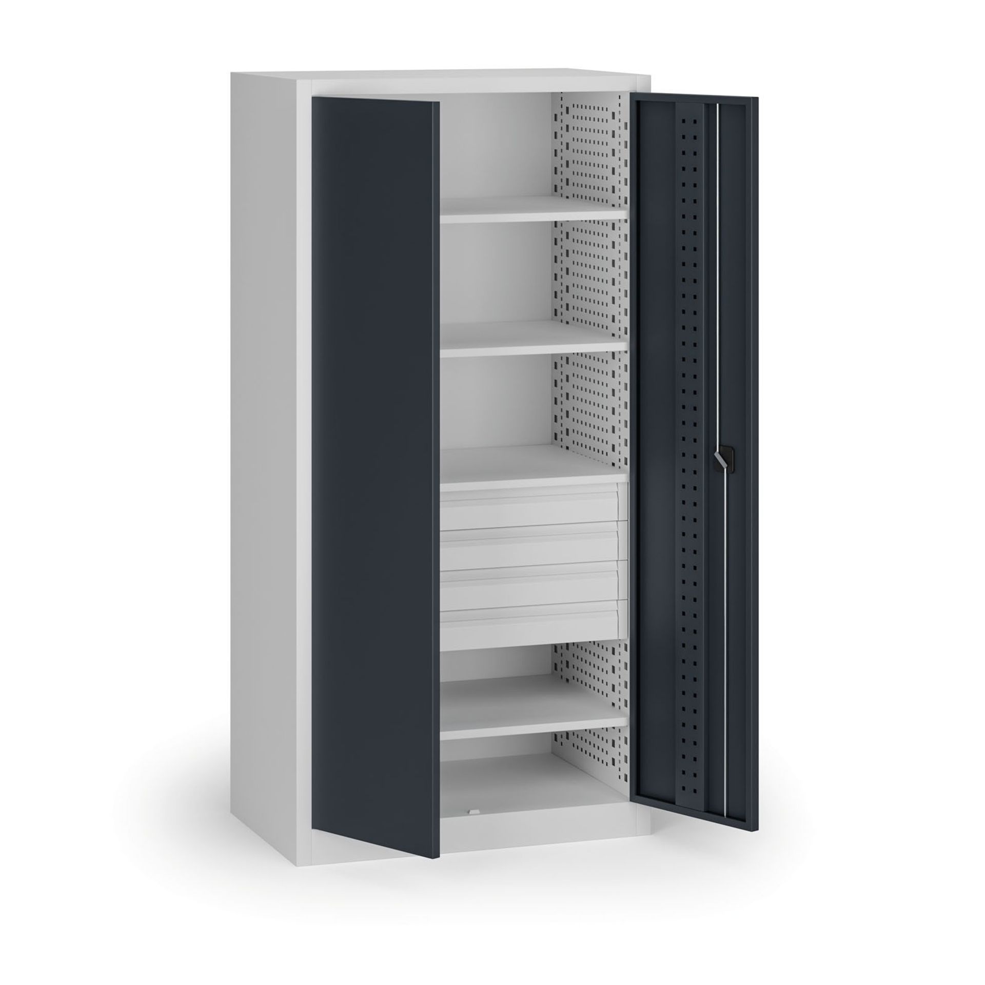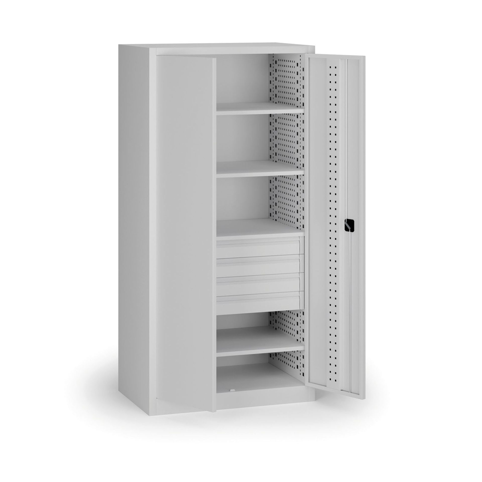 /Dílenský nábytek a vybavení/Dílenské skříně/Dílenské skříně se zásuvkami/Policová dílenská skříň na nářadí KOVOS, 4 police, 4 zásuvky, perforovaná, 950 x 600 x 1950 mm, modrá