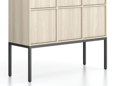 Nejvýraznější prvek se nachází ovšem ve spodní části skříně. Kancelářskou skříň / regál elegantně doplňuje výraznější kovová podnož, která dodává celé konstrukci lehkost, stabilitu a industriální vzhled. Podnož je pevně kotvena šrouby ze spodní části korpusu a ošetřena práškovým lakem v barvě RAL 9005 (černá). Díky praktickému zvýšení skříně nad podlahou působí nábytek vzdušněji a zároveň se usnadňuje i úklid pod ním.