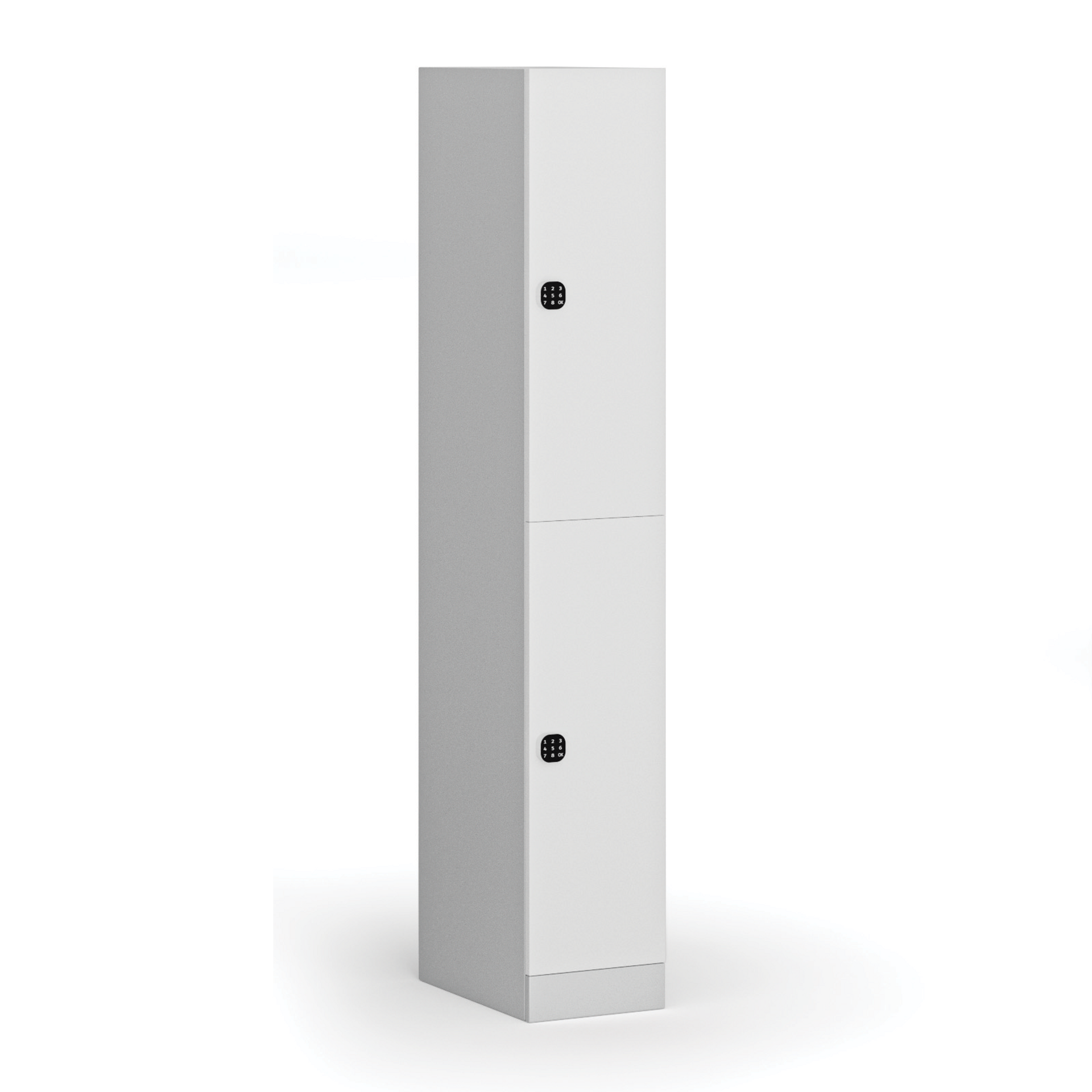 Skříňku s šířkou 300 mm tvoří 2 uzamykatelné boxy. Každý box poskytuje dostatek místa pro uložení osobních věcí, batohů či tašek. Toto úsporné a přitom bezpečné, uzamykatelné řešení je ideální všude tam, kde je potřeba šetřit místem a zároveň není nutné zavěšovat delší oděvy.