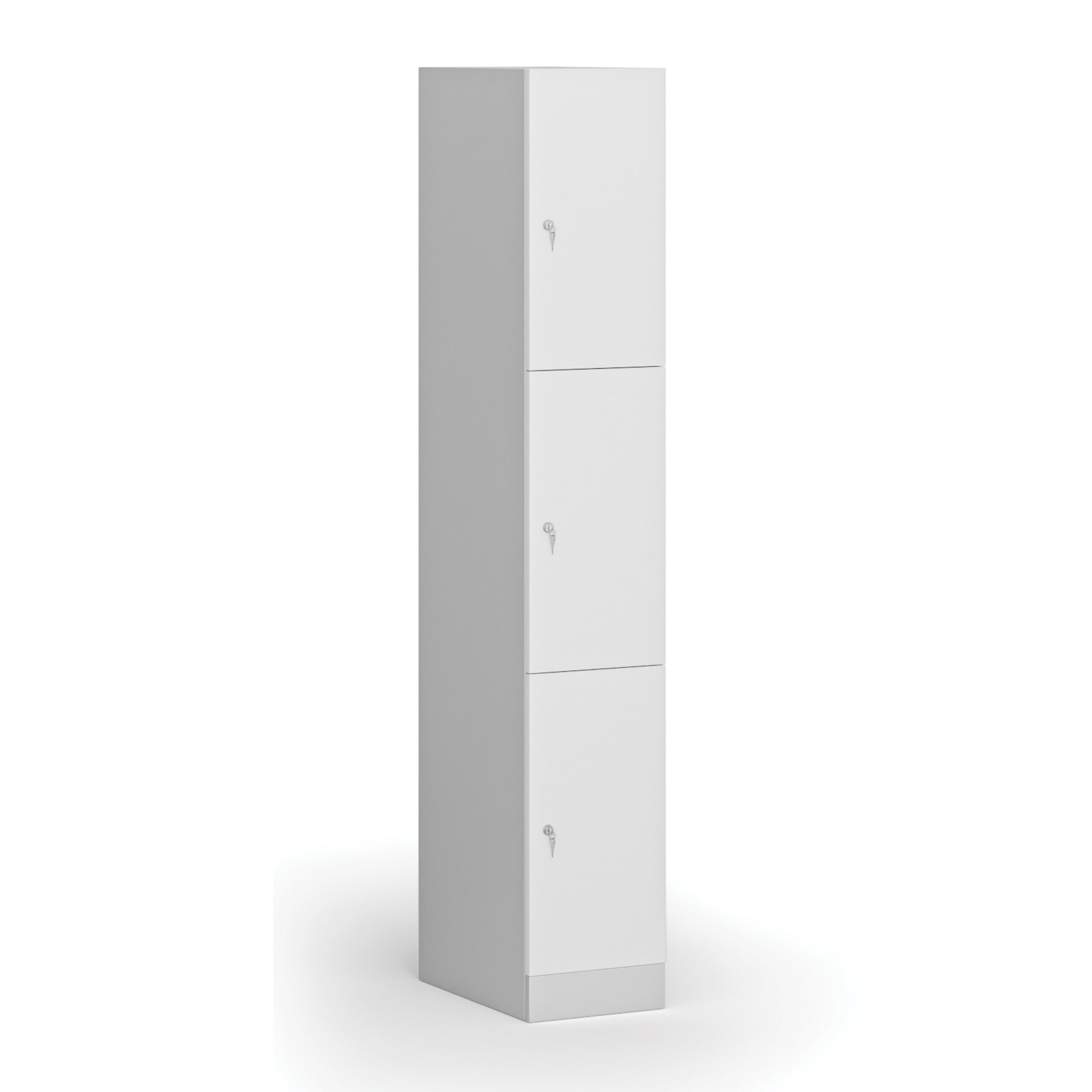 Skříňku s šířkou 300 mm tvoří 3 uzamykatelné boxy. Každý box poskytuje dostatek místa pro uložení osobních věcí, batohů či tašek. Toto úsporné a přitom bezpečné, uzamykatelné řešení je ideální všude tam, kde je potřeba šetřit místem a zároveň není nutné zavěšovat delší oděvy.