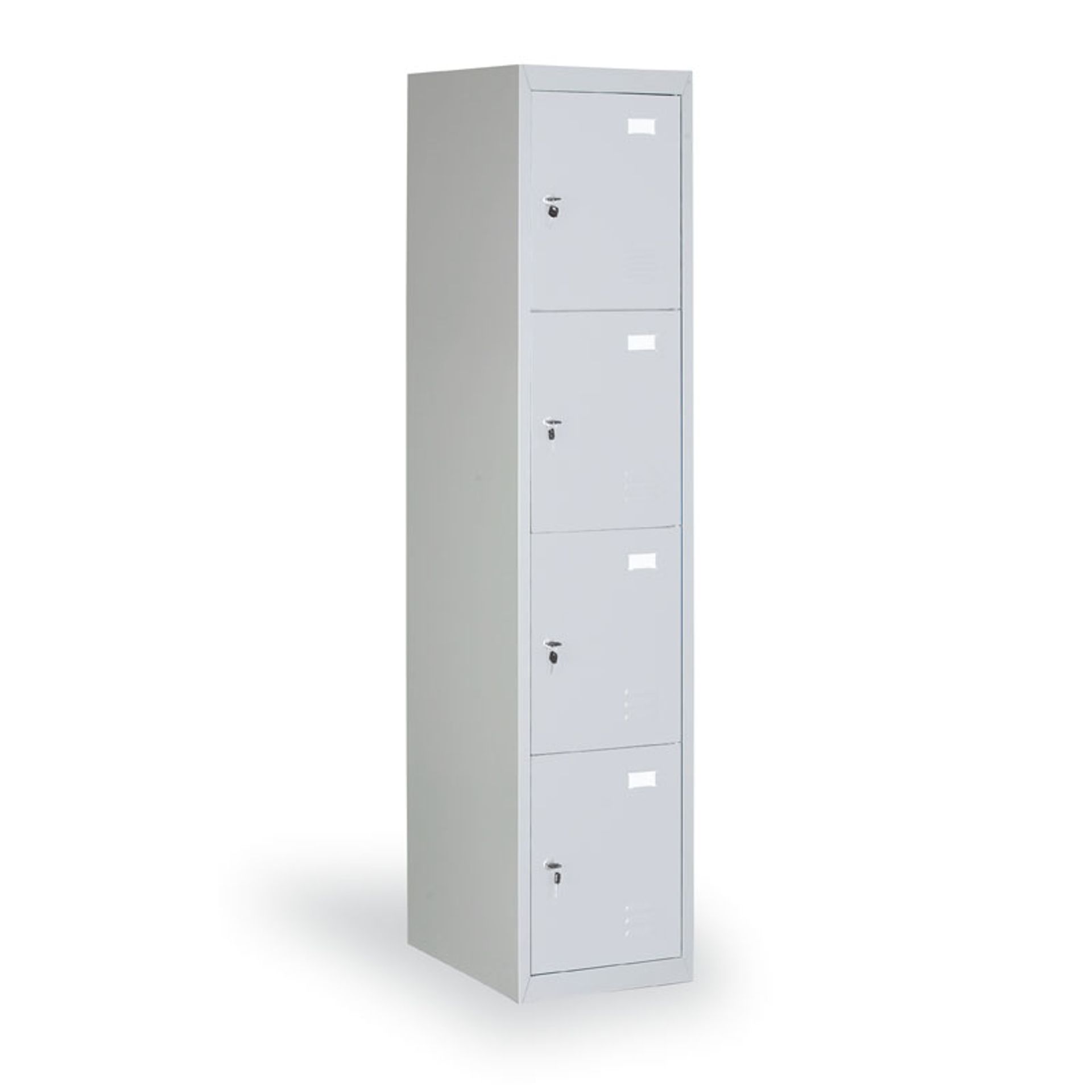 Skříňku s šířkou 380 mm tvoří 4 uzamykatelné boxy. Každý box poskytuje dostatek místa pro uložení osobních věcí, batohů či tašek. Toto úsporné a přitom bezpečné, uzamykatelné řešení je ideální všude tam, kde je potřeba šetřit místem a zároveň není nutné zavěšovat delší oděvy.