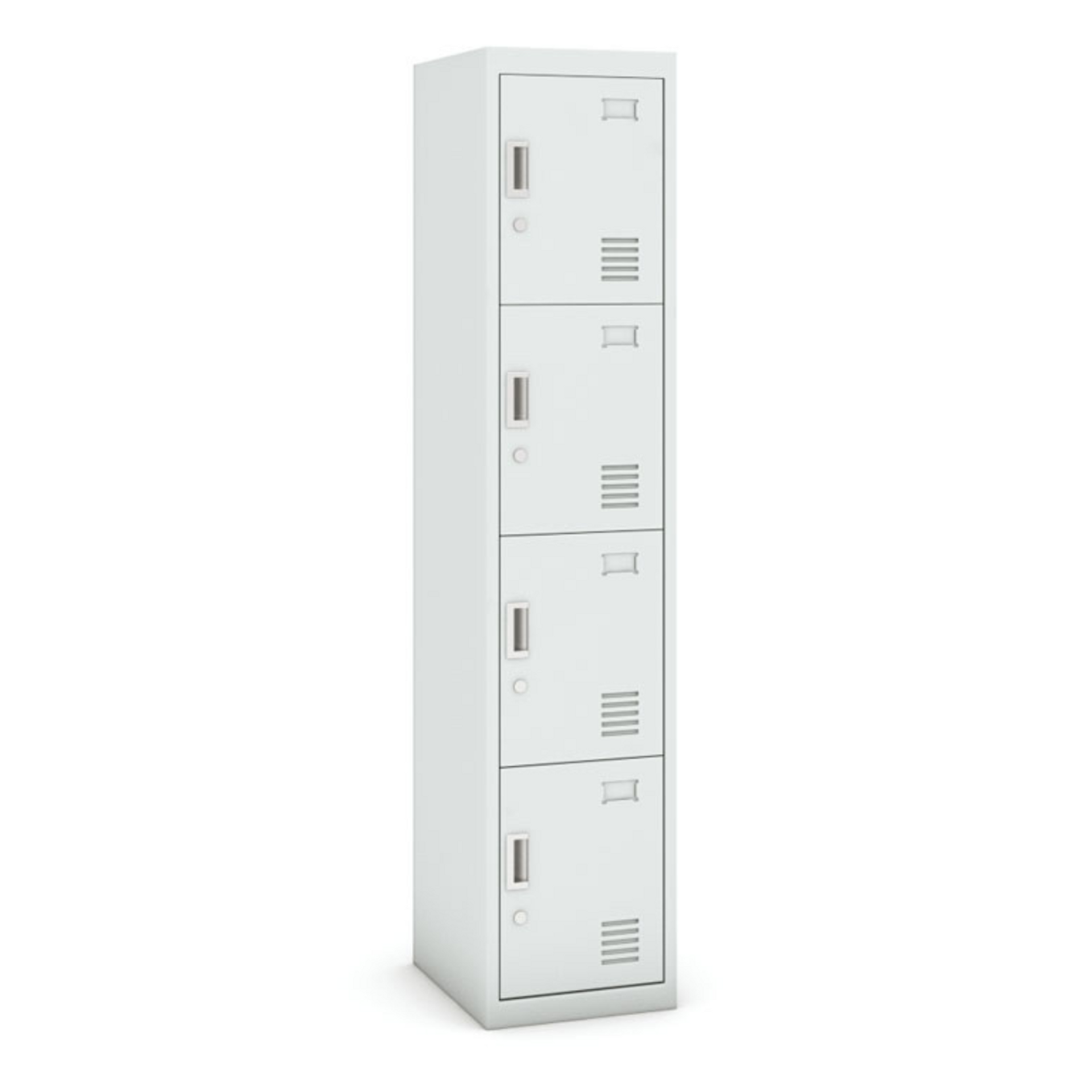 Skříňku s šířkou 380 mm tvoří 4 uzamykatelné boxy. Každý box poskytuje dostatek místa pro uložení osobních věcí, batohů či tašek. Toto úsporné a přitom bezpečné, uzamykatelné řešení je ideální všude tam, kde je potřeba šetřit místem a zároveň není nutné zavěšovat delší oděvy.