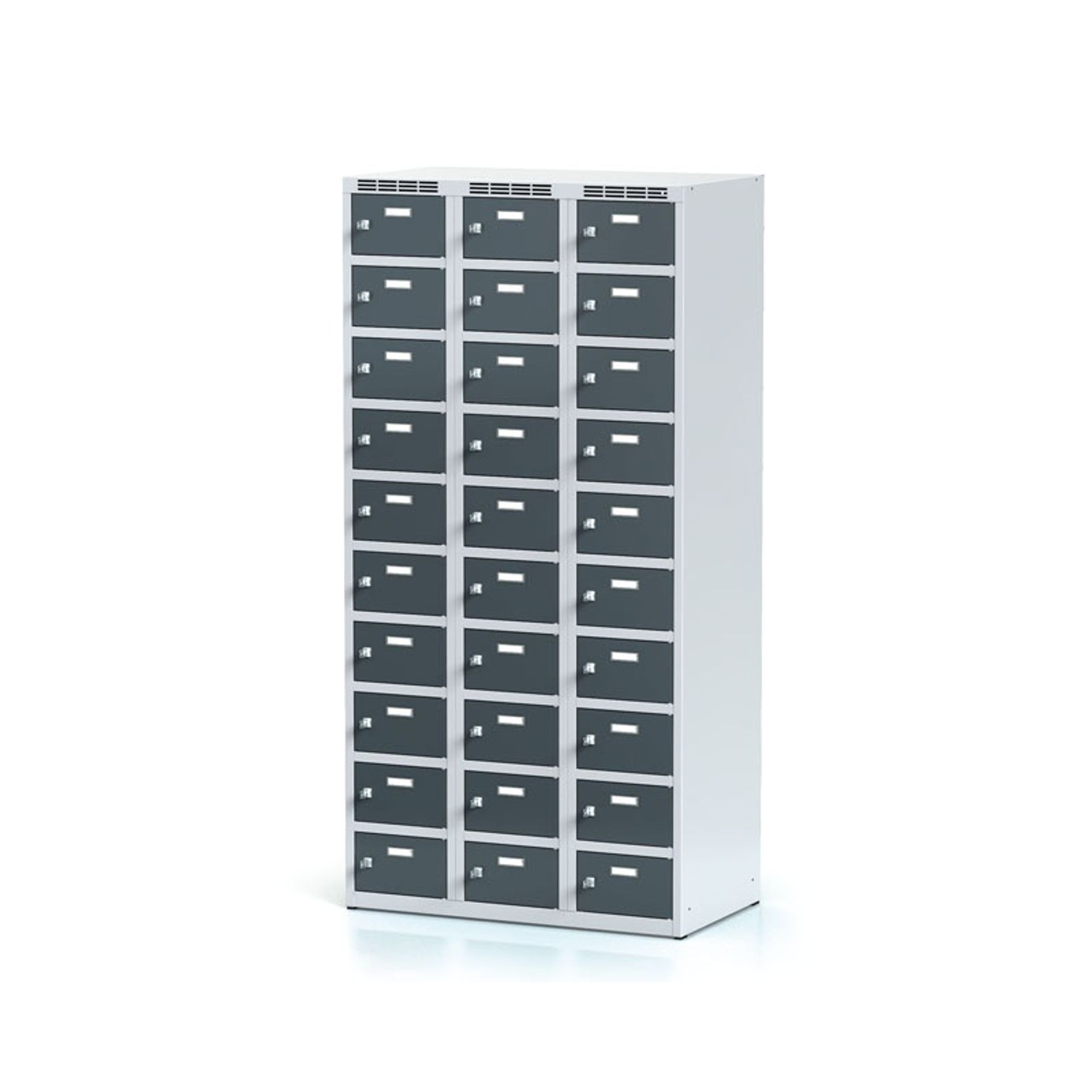 Skříňku s šířkou 300 mm tvoří 30 uzamykatelných boxů. Každý box poskytuje dostatek místa pro uložení osobních věcí, batohů či tašek. Toto úsporné a přitom bezpečné, uzamykatelné řešení je ideální všude tam, kde je potřeba šetřit místem a zároveň není nutné zavěšovat delší oděvy.