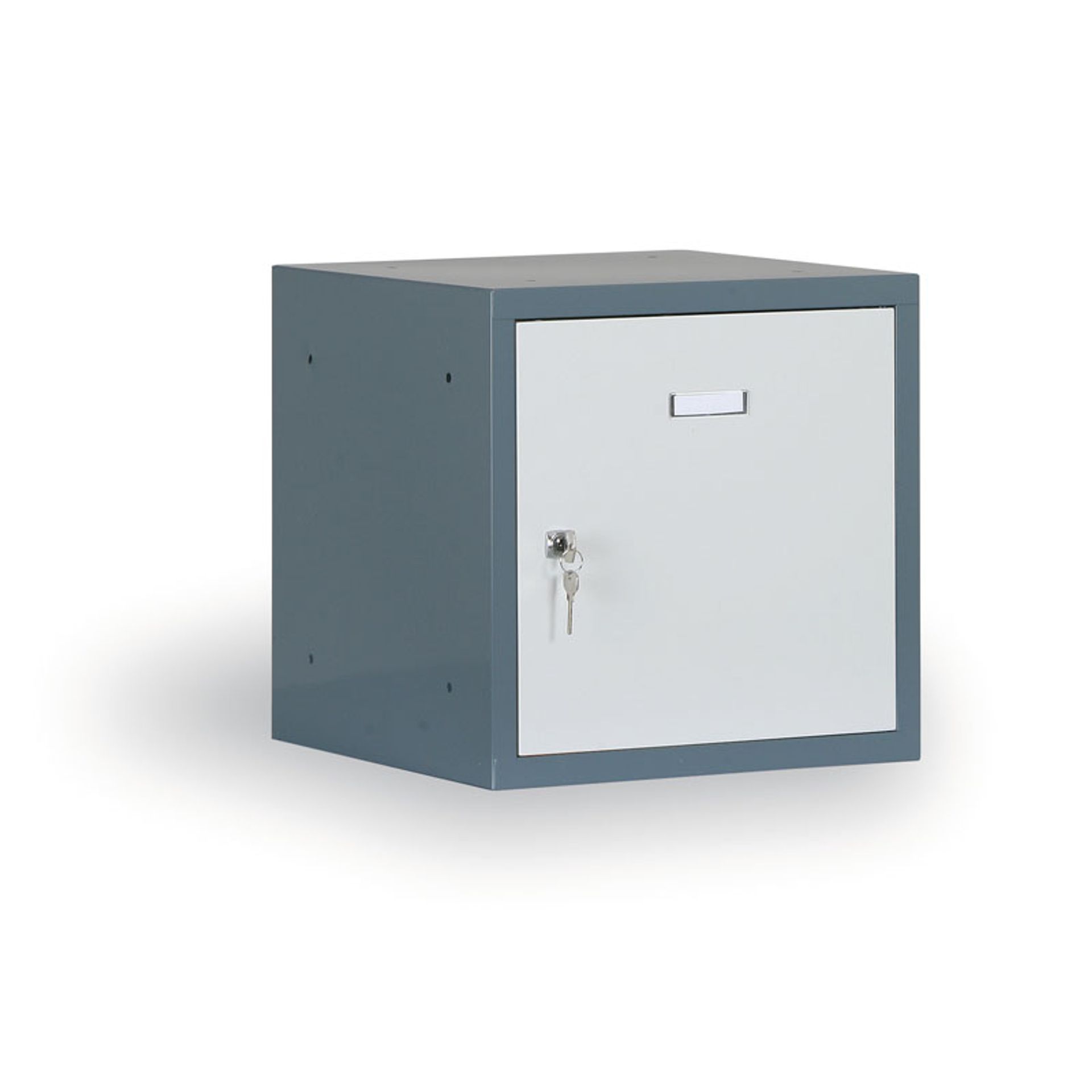 /Šatny a sociální zařízení/Šatní skříňky/Kovové šatní boxy/Šatní skříňka S6 s uzamykatelným boxem 300 x 300 x 300 mm, cylindrický zámek, tmavě šedá, modré dveře