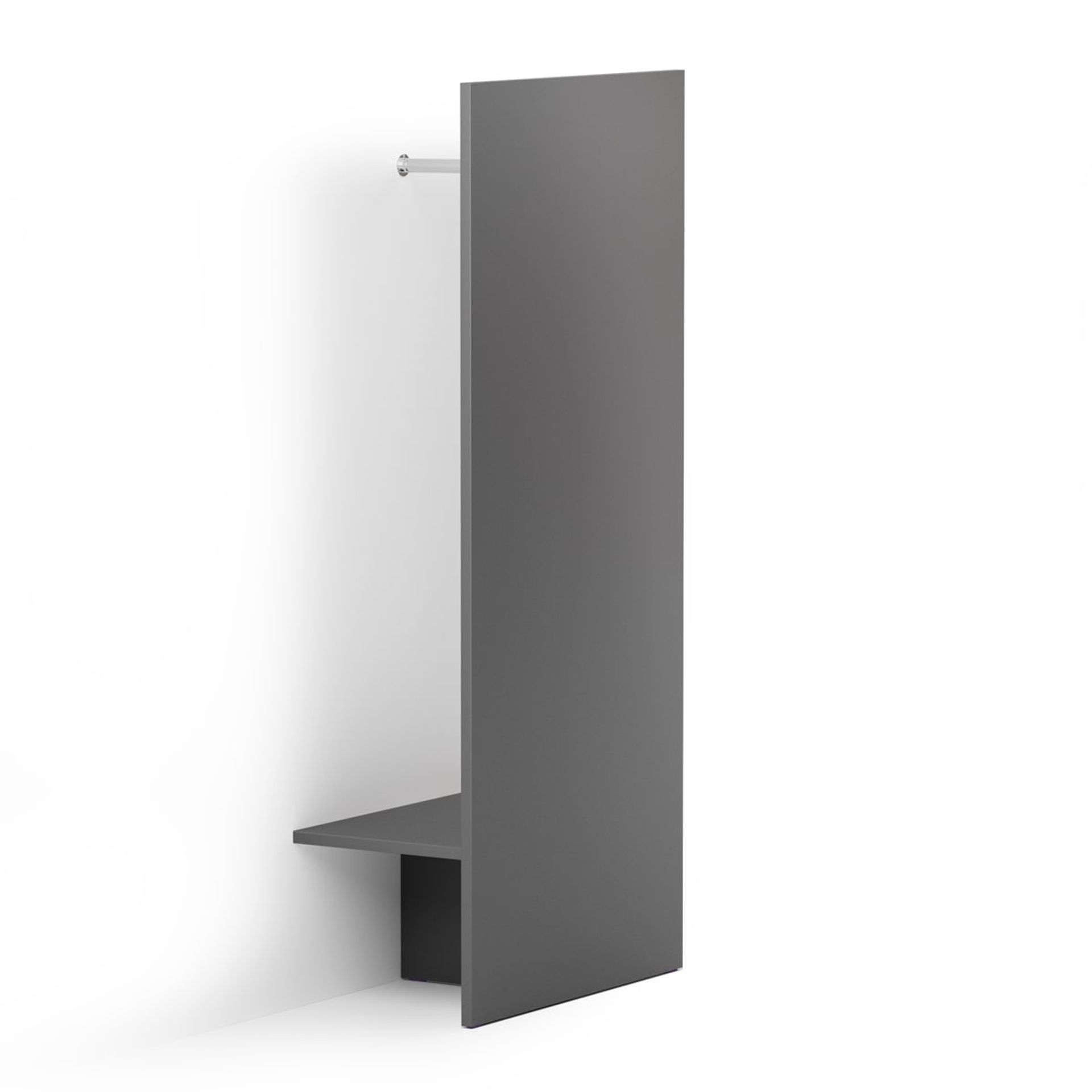 Šatní zástěna BLOCK je umístěna ke zdi, kde je jednoduše kotvená skrze šatní tyč a spodní polici. Vleze se zde několik ramínek a při šířce panelu 80 cm budou mít Vaše šaty dostatek prostoru. Povrch panelu je odolný a snadno omyvatelný - můžete jej tedy využít jako "nástěnku", na kterou můžete lepit například vzkazy pro kolegy. Nábytek BLOCK je vyroben z laminované dřevotřísky o síle 18 mm.