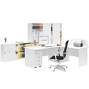 Sestavu tvoří: 2x vysoká skříň zasouvací, 1x nízká skříň zasouvací, 1x vysoká skříň otevřená, 1x nízká skříň otevřená, 1x stůl psací 1400x800 mm, 1x stůl psací 1000x800 mm, 1x spojovací stolek, 1x stolní paraván, 1x pojízdný zásuvkový kontejner