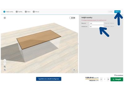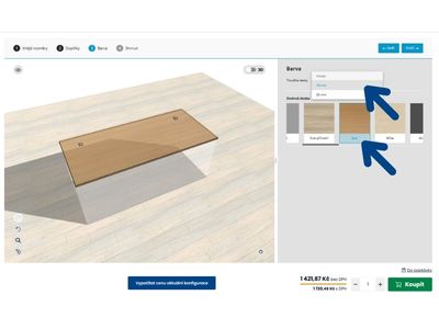 Konfigurátor stolové desky na míru je na stránce automaticky načtený. Kliknutím na tlačítko „Konfigurovat na míru“ v horní části stránky se pouze přesunete přímo ke konfigurátoru. Mezi jednotlivými kroky návrhu se můžete pohybovat pomocí tlačítek „Zpět“ a „Další“ nebo kliknutím na název konkrétní sekce v horní části konfigurátoru. Pro lepší přehled návrhu máte k dispozici také funkce pro přiblížení, 3D náhled, zapnutí či vypnutí stínu a návrat do výchozího pohledu, stejně jako možnost vrátit nebo znovu provést poslední úpravy.